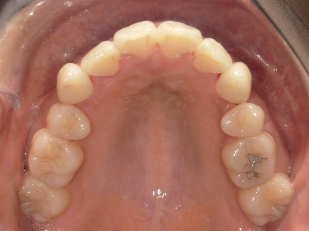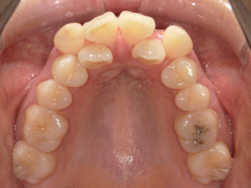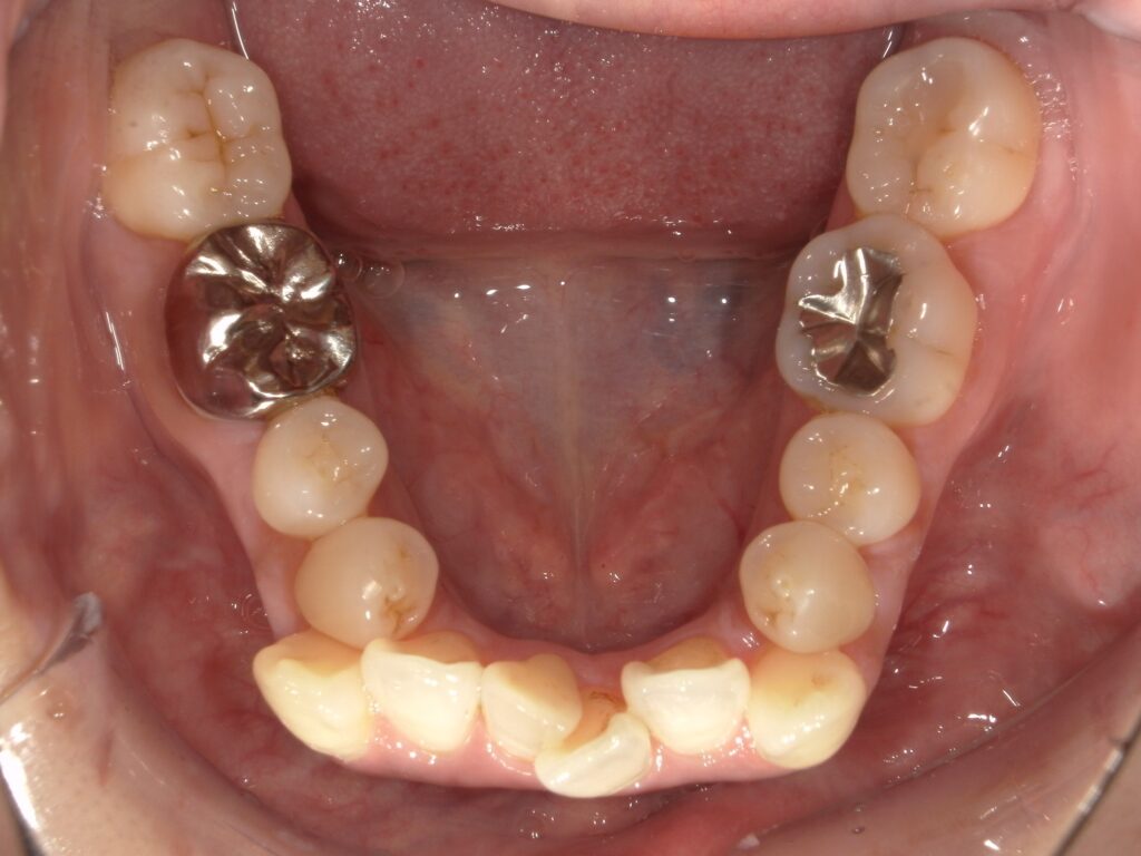 現状でも歯みがきがしづらい状況の中、ワイヤーが付いてさらに磨けなくなることへのストレスや、ガタツキが大きいので痛みが強いことへの不安、装置で目立ってしまうこと等から、ご本人はワイヤーではなくマウスピースで矯正したいという気持ちを諦めきれず、当院を見つけてくださいました。