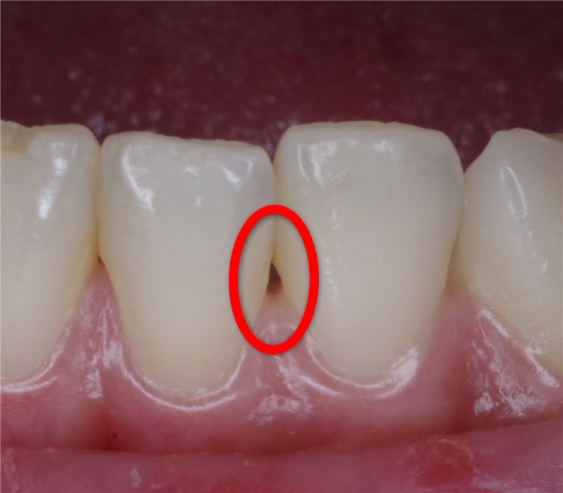 IPR(ストリッピング)は、1歯あたりおよそ〜0.5mmまでを削ることで間隔を調整していきます。結果として削られた歯の形状が逆三角形から四角形に近づき、ブラックトライアングルが解消される場合があります。