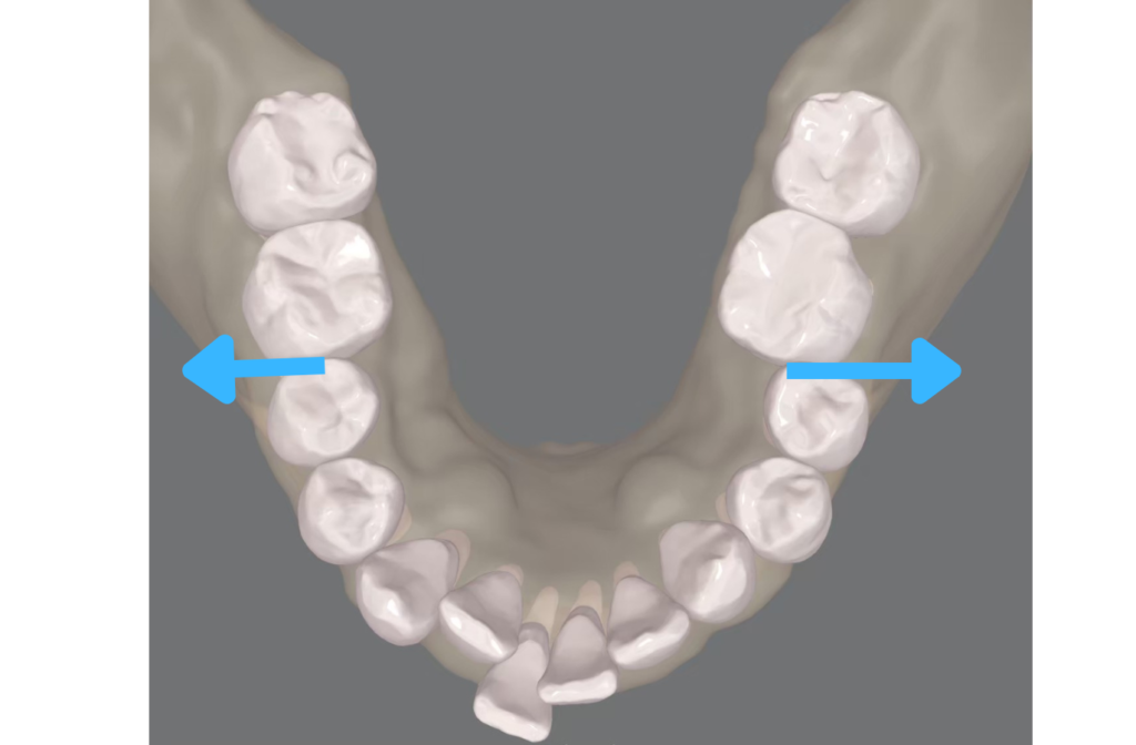 奥歯を、親知らずが生えている方向=あごの一番うしろ側へ少しずつ移動させていく方法です。奥歯が後方へ下がることで、その手前に並ぶ前歯や犬歯をきれいに並べる余裕が生まれます。インビザラインをはじめとするマウスピース矯正は、この遠心移動を得意としており、当院でも重要な役割を担うアプローチです。