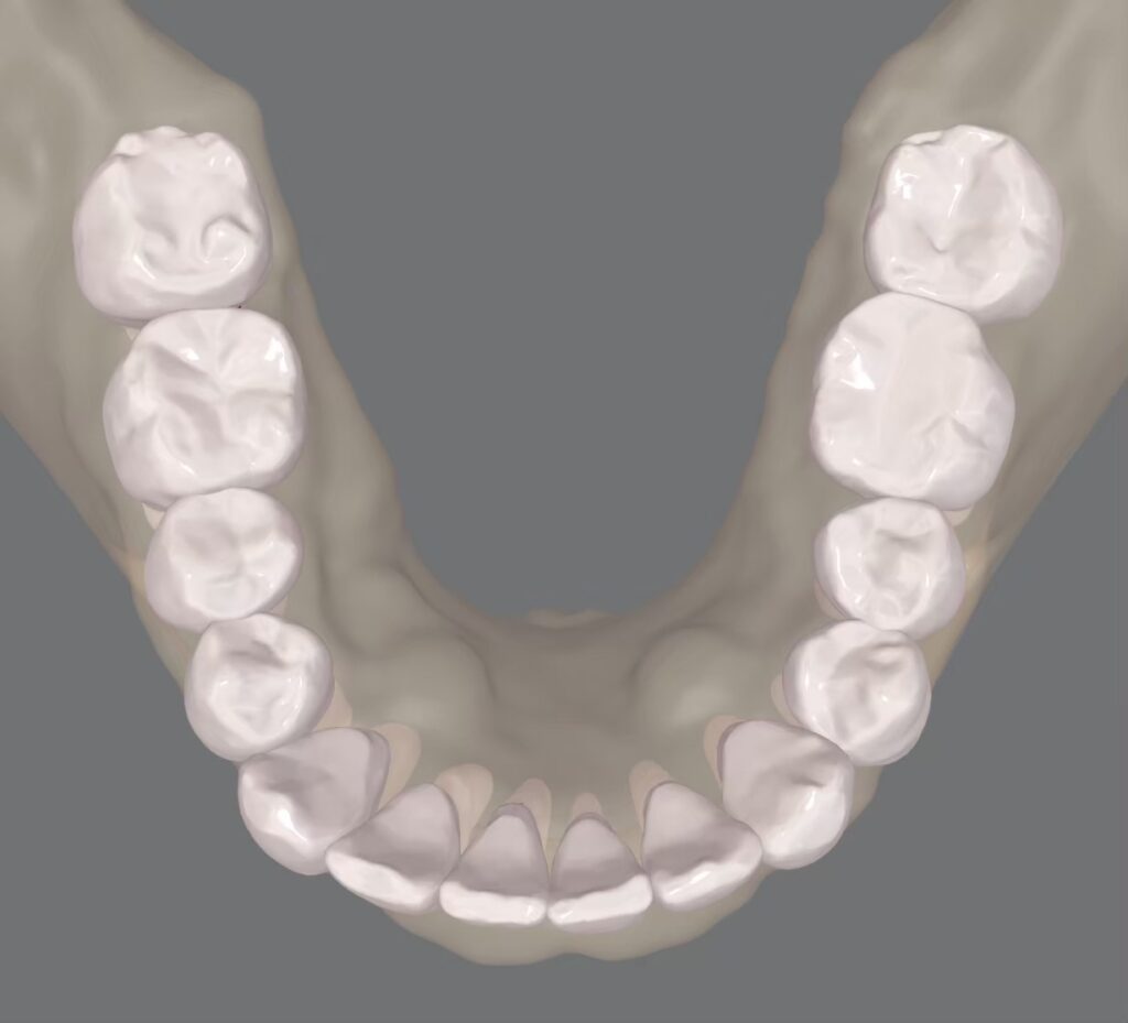一方で、インビザラインのようなマウスピース矯正は、システムとして遠心移動を得意としているという特徴があります。デジタル上で「奥歯を何ミリ後ろへ送るか」をあらかじめ設計し、その移動量を数十枚のマウスピースに分割していくことで、奥歯を計画的に後ろへ移動させていくことができます。