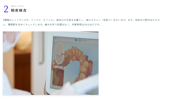 歯科医院のカウンセリングは、実際にはスタッフが大半を行い、歯科医師と喋れるのは5分程度というケースも多いですが、当院のカウンセリングは、すべて院長自身が時間をかけて行っています。